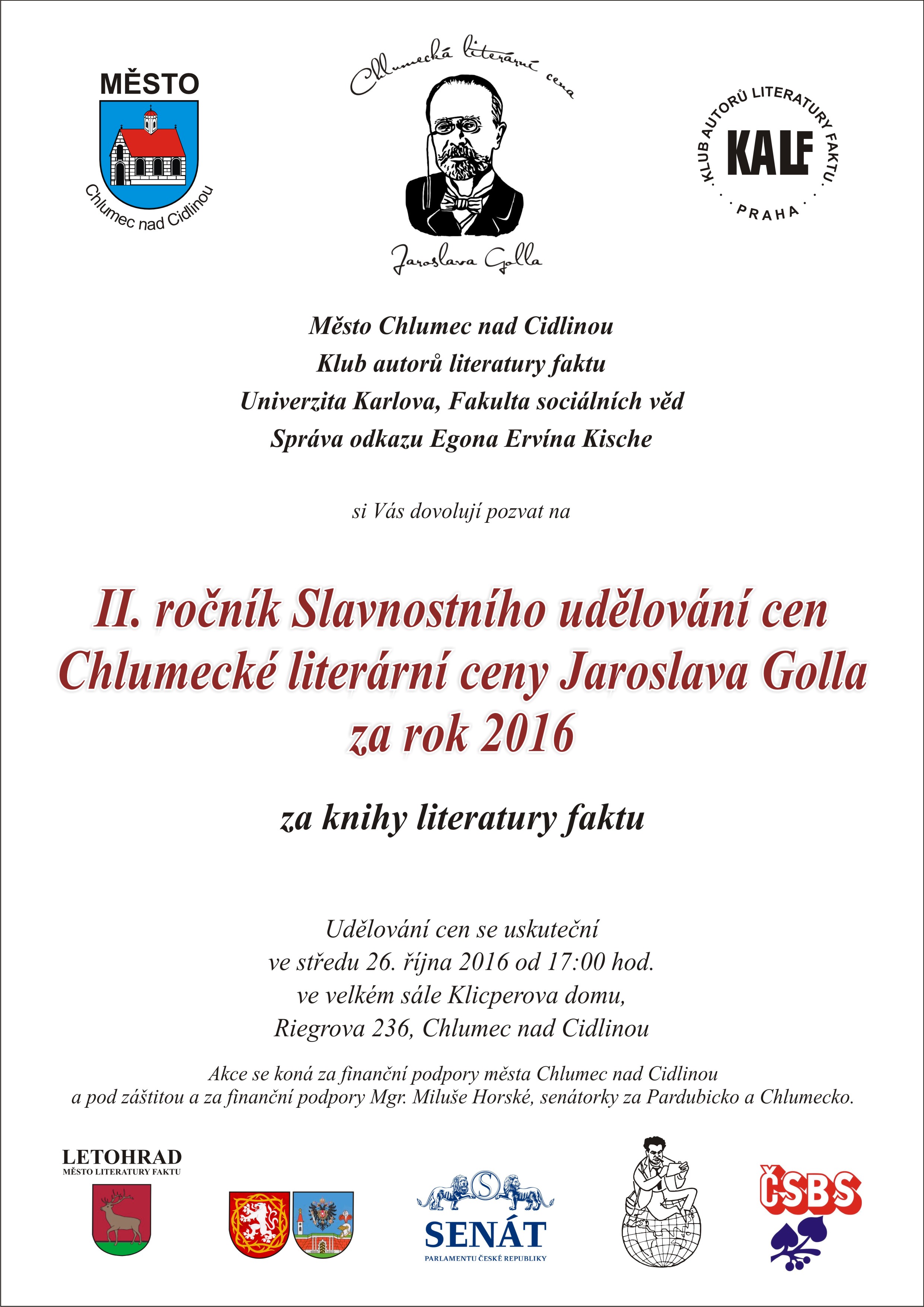 II. ročník Slavnostního udělování cen Chlumecké literární ceny Jaroslava Golla za rok 2016 za knihy literatury faktu.